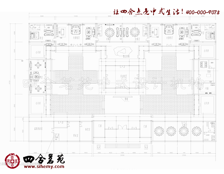 圍合對稱分布于空間,庭院屋檐設(shè)計構(gòu)成一道起伏的線條,磚瓦結(jié)構(gòu)使人感覺到膩理細潤。